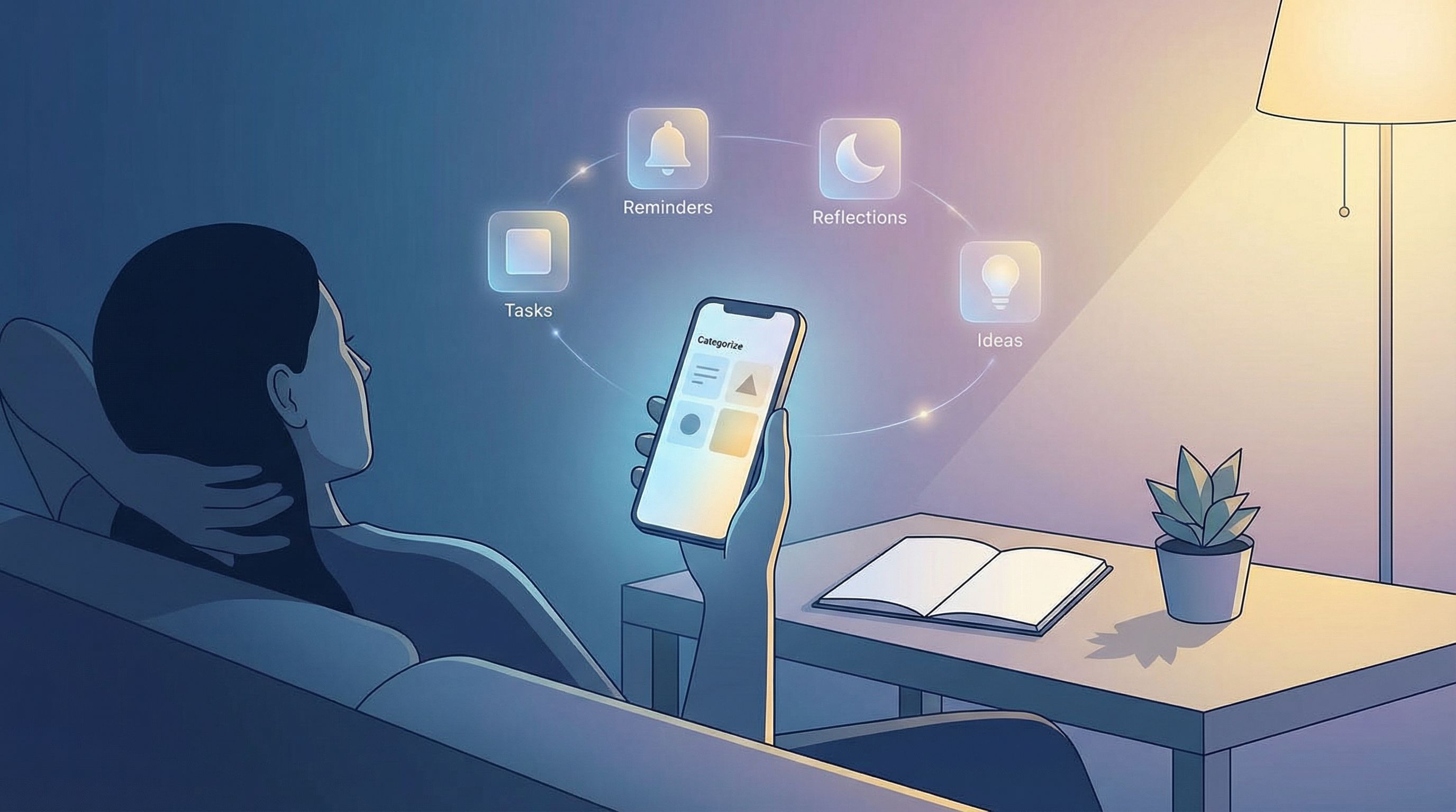- Smart categories quietly sort your life. Tasks, reminders, reflections, dreams, ideas, and learnings are all gently organized for you.